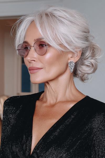 Sleek Silver: Zurückgestyltes Haar mit getönter Sonnenbrille – ab 50