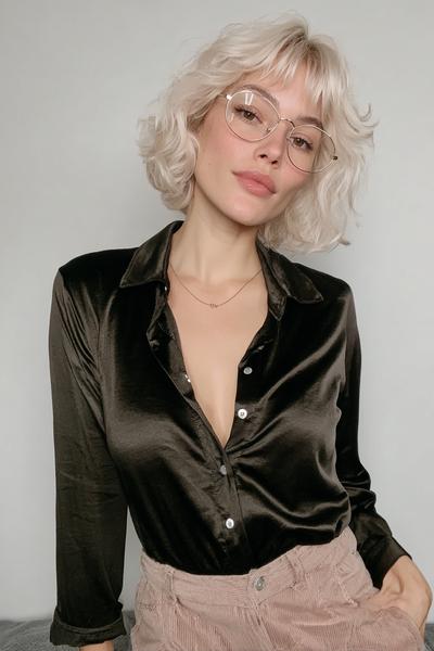 Ein eleganter Long Bob mit weichen Curtain Bangs, perfekt zu der großen Retro-Brille. Die seidige Textur umspielt das Gesicht schmeichelhaft. Mit Hitzeschutz glätten, dann Glanzspray nur in Längen – so bleibt Bewegung und Lichtspiel erhalten.