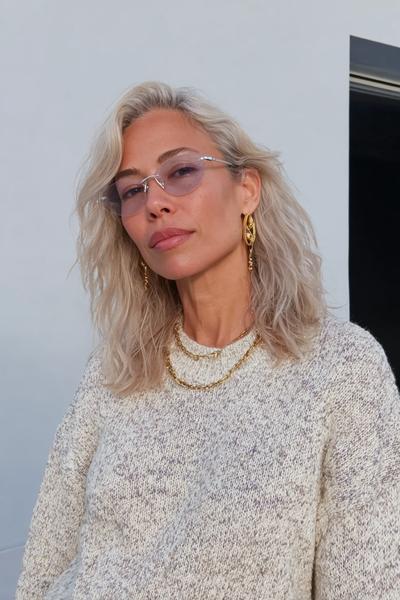 Der soft geschnittene Shag zaubert Fülle, der Fransenpony nimmt Härte aus den Zügen. Die bernsteinfarbene Brille wärmt den kühlen Blondton. Für Alltag: Paste in die Spitzen kneten, damit die Layers lebendig und definiert fallen.