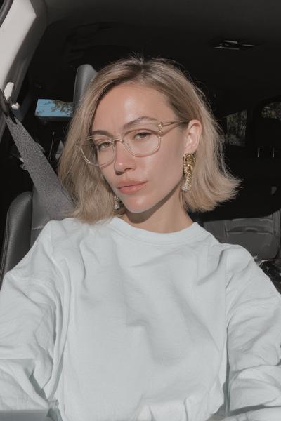 Ein weicher French Shag in pastelligem Blond, seitlich gestylt, trifft die Cat-Eye-Brille perfekt. Die seitliche Fülle liftet optisch. Ich liebe ein bisschen Trockenspray am Oberkopf und eine Spur Pomade an den Spitzen.