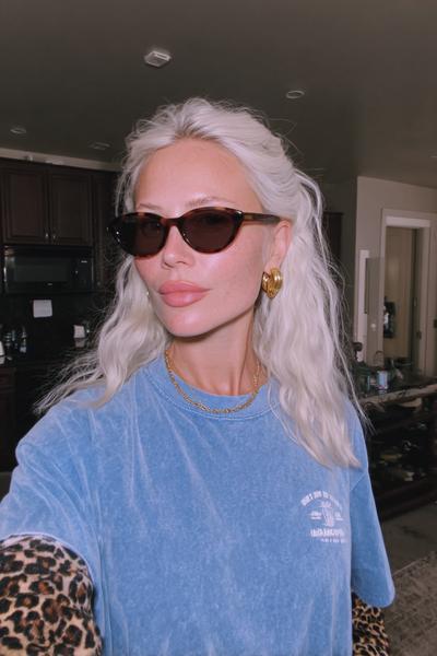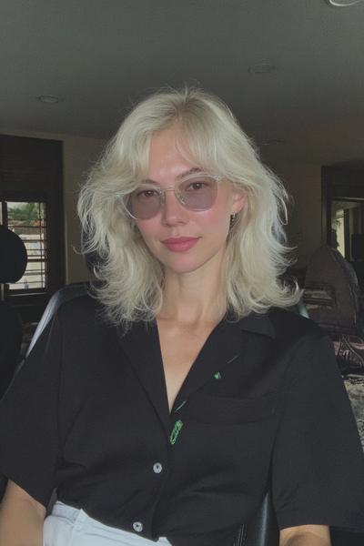 Ein kurzer, leicht fransiger French Bob in Platin, mit offenem Pony – dazu die markante Sonnenbrille. Sea-Salt-Spray für Struktur, dann mit Fingern föhnen. Das Ergebnis: nonchalante Eleganz mit klarer Kontur und Bewegung.