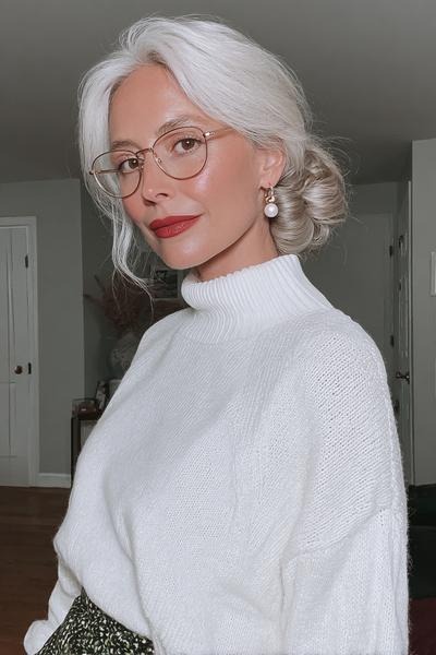 Halbhochgesteckter Silberschimmer mit Brille 50+