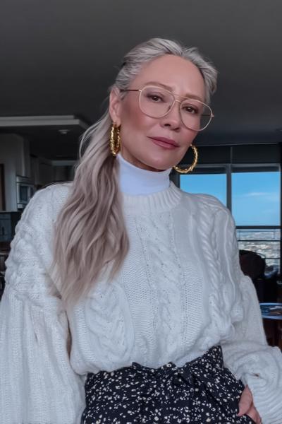Frisuren ab 50 mit Brille: Weiche Silberwellen mit Mini-Sonnenbrille