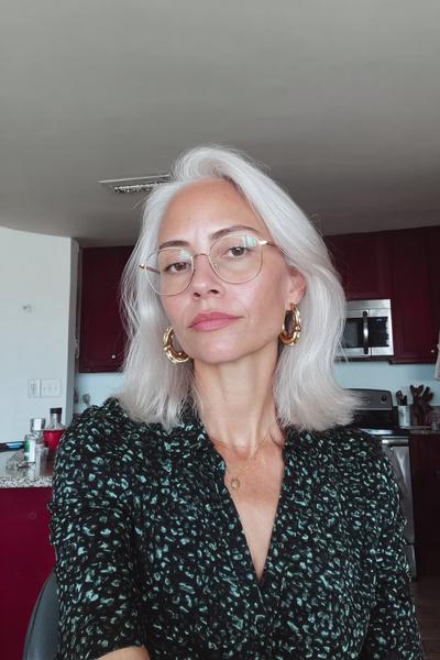 Gerade, ruhige Längen und ein seitlicher Ansatz – dieser Long Bob wirkt smart und zeitlos. Die feine Brille hält das Gesicht offen. Ein paar Tropfen Öl gegen Frizz, dann flach föhnen: fertig, minimalistisch, edel.
