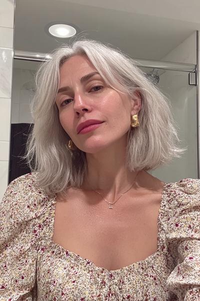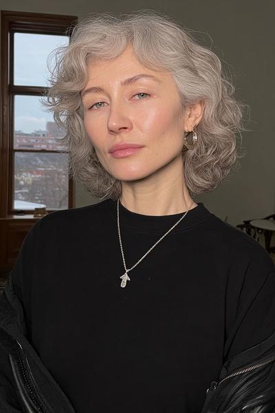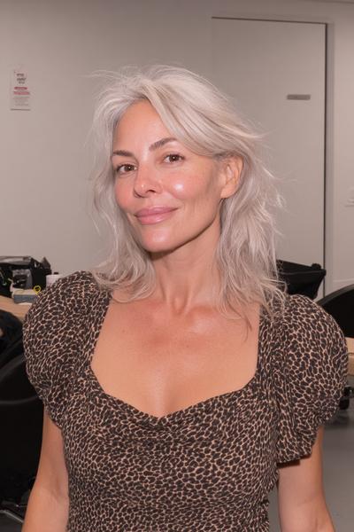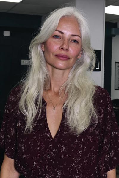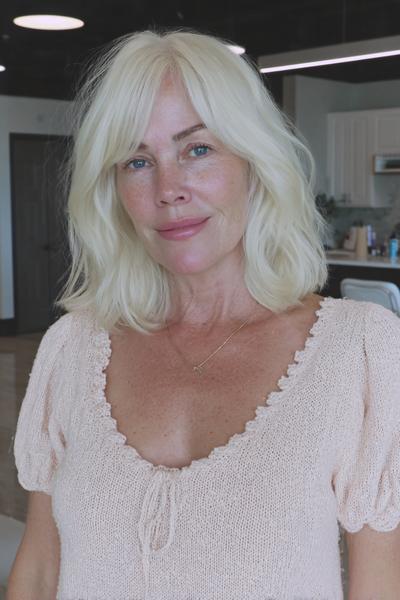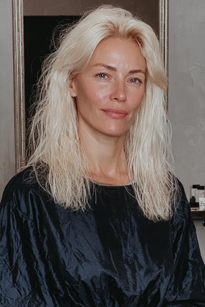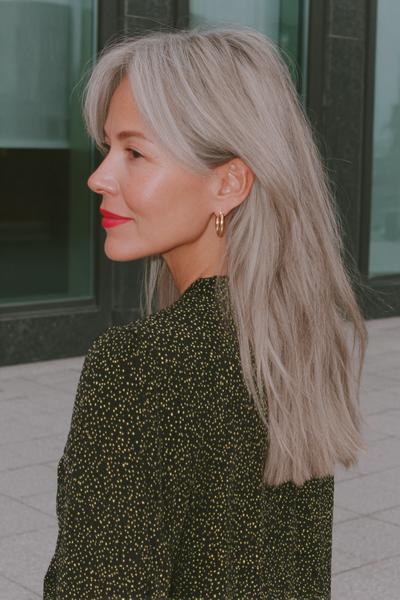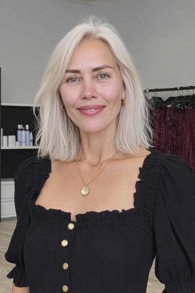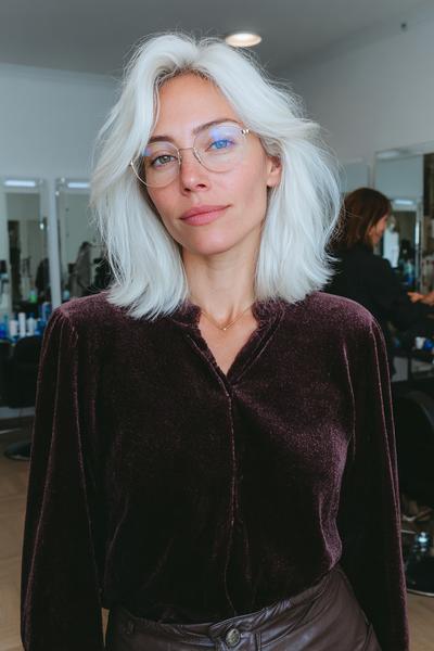 Schulterlang mit Mittel- oder Seitenscheitel, dieser Look lebt von leichten Stufen und silbrigem Glanz. Er rahmt das Gesicht weich. Für mehr Fülle arbeite ich Ansatzspray ein und föhne über Rundbürste.