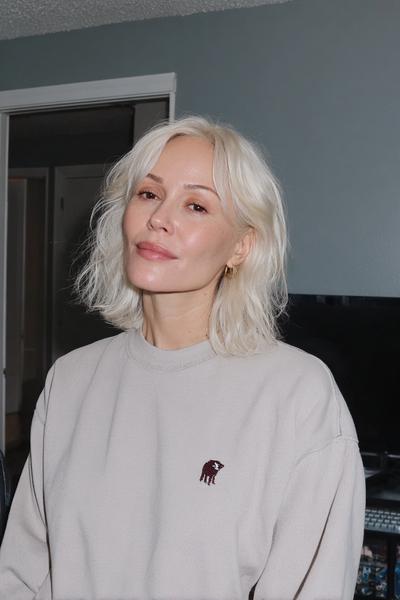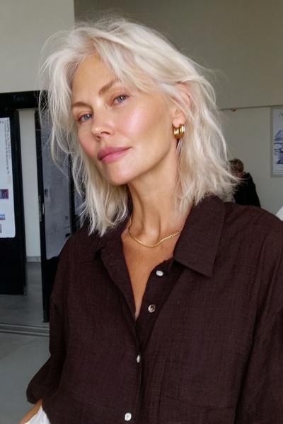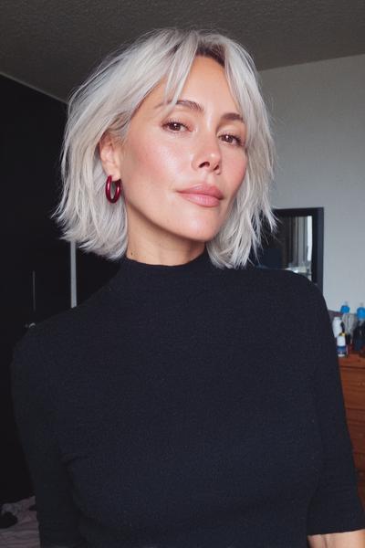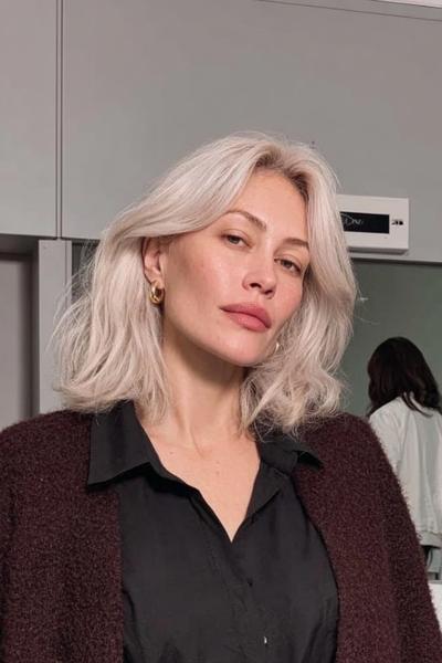Air-Dry-Lob in Platin: roh, unkompliziert und modern. Die natürliche Struktur spricht für sich. Leave-in-Conditioner für Feuchtigkeit, etwas Glanzspray in die Längen. Halblänge, die kreative Leichtigkeit und Alltag problemlos verbindet.