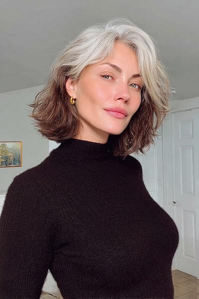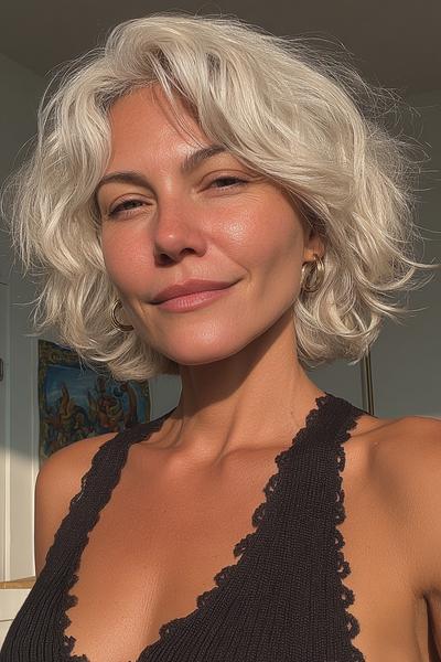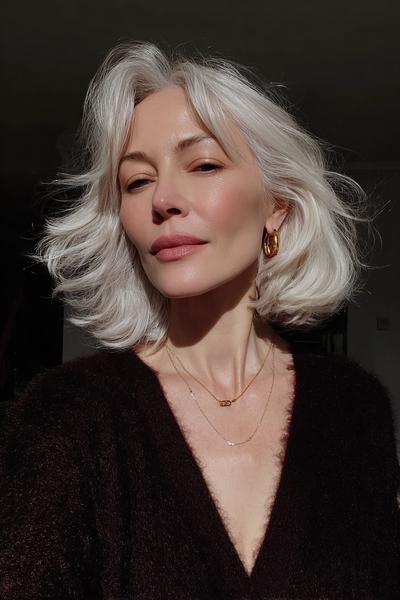Weiche, silbrige Wellen formen einen halblangen Bob voller Sanftheit. Ich empfehle Diffusor und Lockencreme, damit die Textur glänzt und nicht beschwert. Ein Look, der Gesichtszüge umspielt und Wärme plus Licht ins Profil bringt.