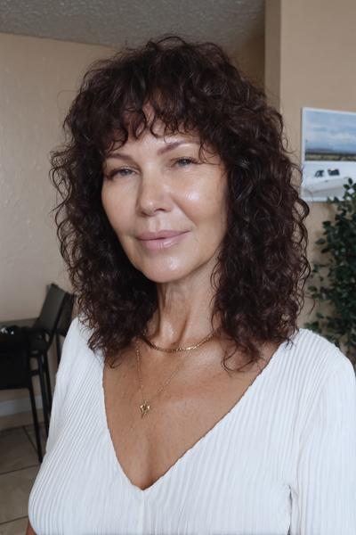 Natürliche Locken in Halblänge mit lockigem Pony – charakterstark und weich zugleich. Feuchtigkeit ist hier die Königin: Leave-in, sanftes Kneten, fertig. Der Schnitt hebt Kringel, ohne Volumen zu beschweren, und lässt die Augen strahlen.