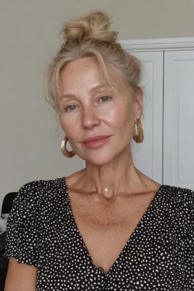 Ich mag diese Nonchalance: halblange Grundlänge hochgesteckt, ein paar Face-Framing-Strähnen bleiben frei. Perfekt für Alltag – chic ohne Aufwand, wirklich herrlich unkompliziert.