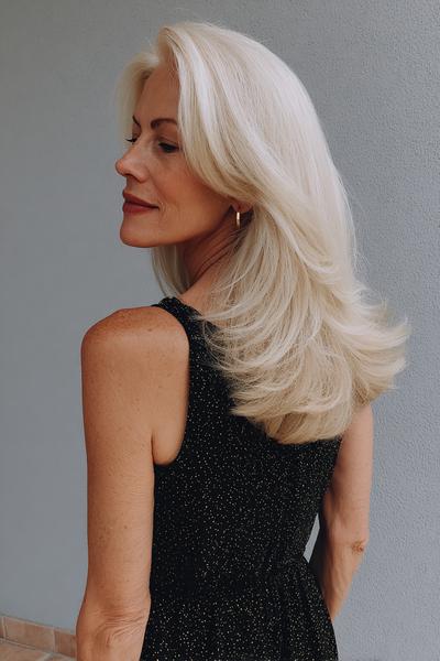 Ein glamouröser Blowout in Schneeweiß – ich liebe die geschwungenen Längen und den Seitenvolumen-Lift. Das verjüngt sichtbar. Vorbereitung: Volumenschaum, dann mit Rundbürste über die Kontur ziehen. Zum Schluss Kaltluft fixieren, damit der Halt bleibt und alles schimmert.