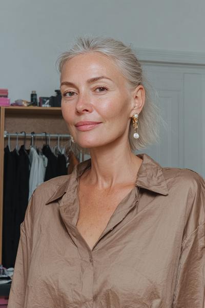Ein eleganter, halblanger Stufenschnitt mit weichem Seitenvolumen – so schmeichelt man reifer Haut. Ich liebe die sanften Föhnwellen und den seitlichen Fall, der Konturen mildert. Für Glanz: Hitzeschutz, dann mit Rundbürste ausdrehen, Finish mit Tropfen Serum.
