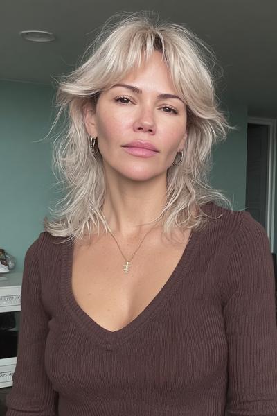 Moderner Shag mit Mikro-Pony – bewusst fransig und super spielerisch. Die Stufen pushen das Volumen, die Länge bleibt halblang und vielseitig. Mein Styling: Texturcreme in die Spitzen, Diffusor auf niedriger Hitze. So wirkt der Look frei, frisch und charakterstark.