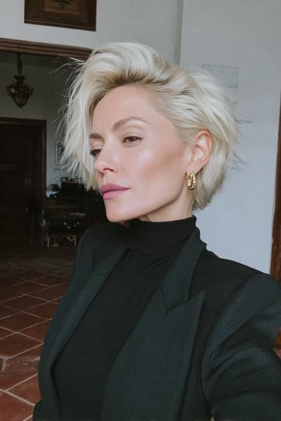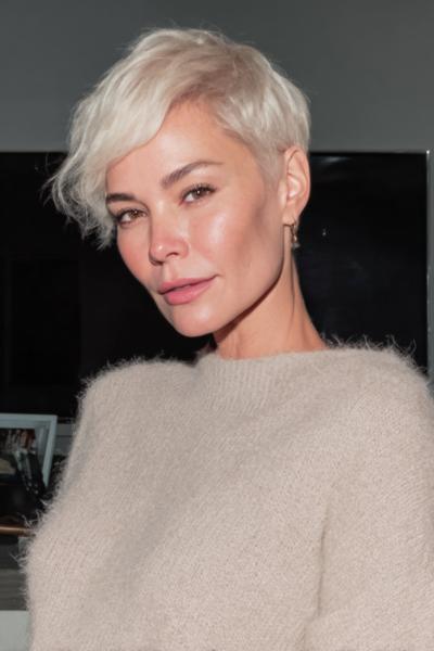 Ein sanfter Pixie mit seitlichem Pony und viel Textur: Die Stufen geben Leichtigkeit, das kühle Platinblond sorgt für Strahlkraft. Mit Volumenspray anheben, trocken „kneten“, und die Konturen weich ausblenden – fertig, lässig, sehr chic.