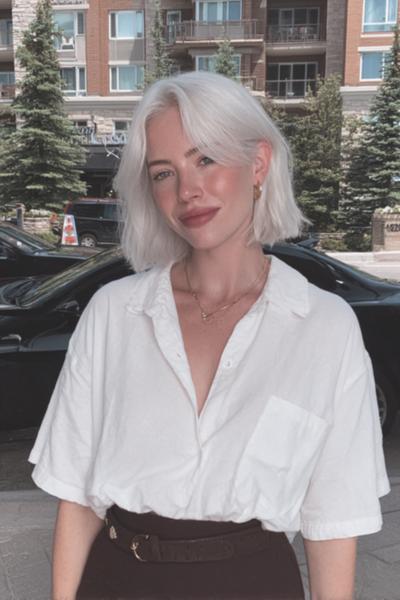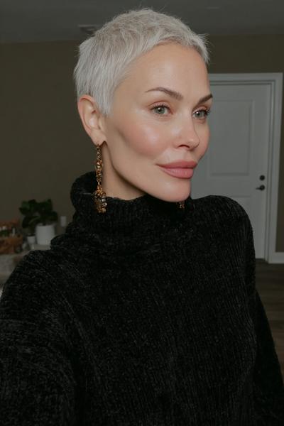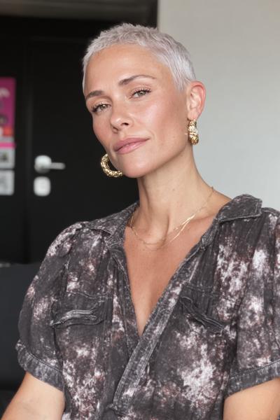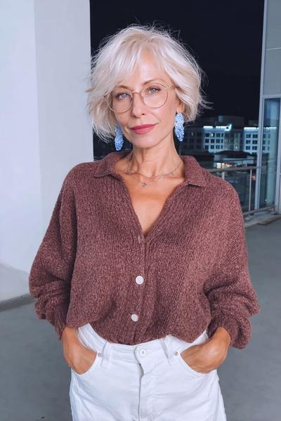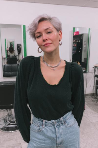 Der kurze Silber-Shag spielt mit Stufen, Fransen und natürlicher Bewegung. Ich liebe die kühle Farbe zu warmen Accessoires – kontrastreich und urban. Mit Volumenspray am Ansatz entsteht dieses effortlessly undone Finish, das den Blick sofort fesselt.
