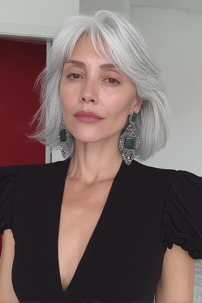 Ein kürzer wirkender Long-Bob mit sanften Stufen und Curtain Bangs: natürliches Grau trifft auf Eleganz. Ich liebe den fließenden Fall und den soften Pony. Mit Glanzspray und leichter Föhnbewegung entsteht mühelose, edle Struktur.