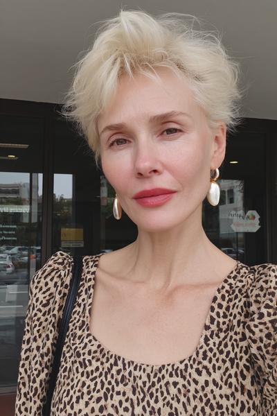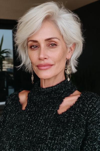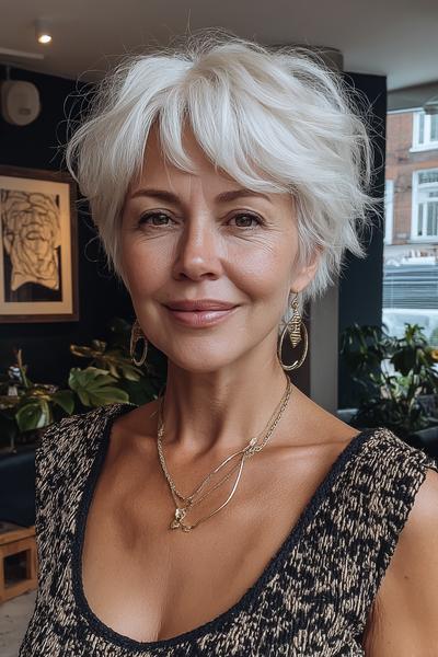 Ich liebe diesen kurzen, welligen Pixie: Platin plus zarte Bewegung bringt sofort Frische. Der seitliche Schwung umrahmt das Gesicht elegant. Mein Tipp: etwas Sea-Salt-Spray einkneten, dann mit Fingern trocknen – lässig, modern, super leicht.