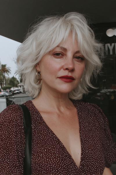 Dieser kurz gehaltene Shag-Bob lebt von luftigen Stufen und einer weichen Curtain-Fringe. Die silberblonde Nuance lässt die Textur leuchten. Ich style ihn mit Meersalzspray und Diffusor – lässig, modern, null steif.