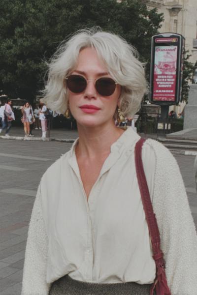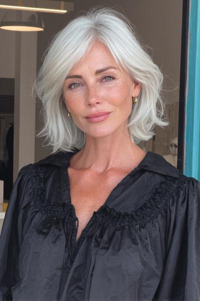 Der seitliche Side-Sweep gibt dem gestuften Kurz-Bob Richtung und Leichtigkeit. Ich mag, wie die silbrigen Strähnen Tiefe schaffen. Ein Spritzer Trockenshampoo am Ansatz hält Volumen und frischt zwischendurch perfekt auf.