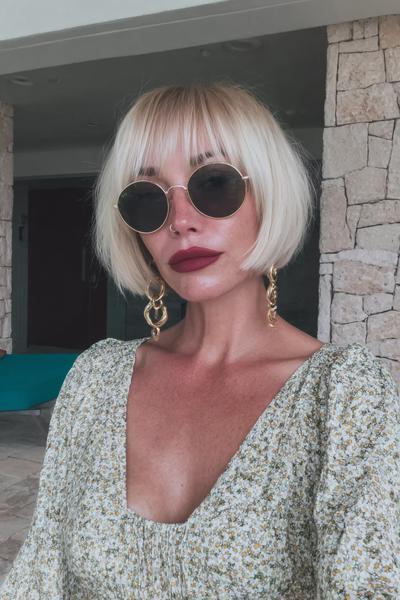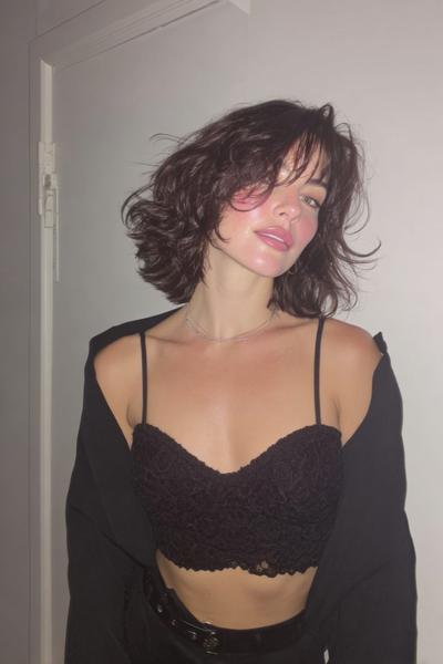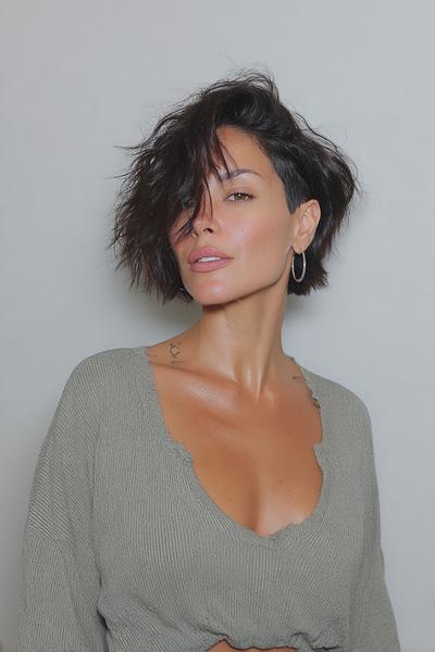 Ein wilder Wavy-Bob mit fransigen Enden – undone im besten Sinne. Meersalzspray, Diffusor, dann Pony locker aufbrechen. Das Ergebnis: französische Nonchalance, viel Bewegung und ein Look, der tagsüber lässig, abends spielerisch elegant bleibt.