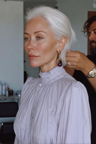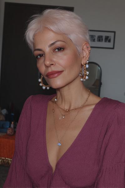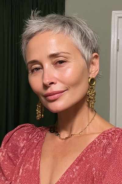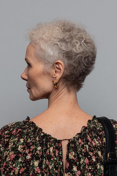 Ein weicher Salt-and-Pepper-Pixie mit mikrofeiner Textur. Die Seiten bleiben clean, oben sorgen Point-Cut-Stufen für Luft. Etwas Stylingcreme in den Fingerspitzen, leicht zupfen – und schon wirkt alles lässig, smart, unfassbar zeitlos.