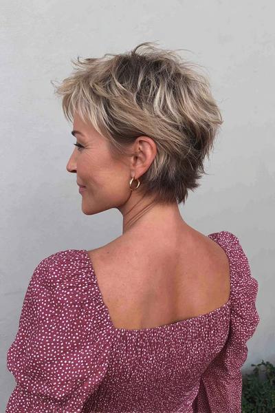 Dieser Pixie liebt Höhe am Oberkopf und weiche Nackenlinien. Ein Spritzer Trockenshampoo für Grip, dann flexible Sprays – sofort Struktur. Die Strähnen bringen Tiefe, der Look bleibt spielerisch und edel.