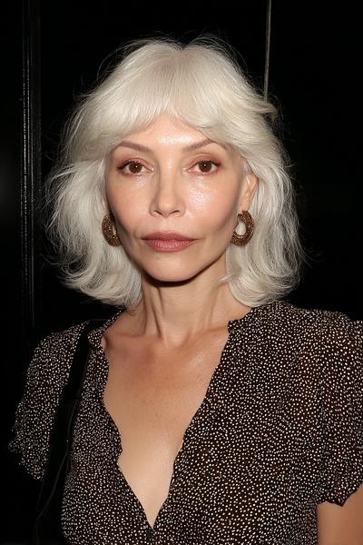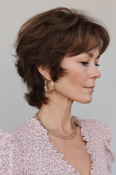 Ein federleichter Shag-Bob mit sanftem Volumen an der Krone. Die gestuften Konturen geben Bewegung, der seitliche Pony umschmeichelt. Mit leichter Mousse föhnen, Spitzen soft ausdrehen – ein Look zwischen Retro und frisch-aktuell.