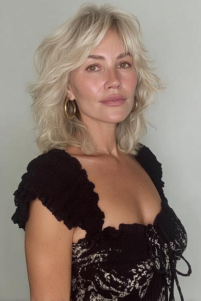 Platinblonder Shag-Mullet mit fransigem Pony: Rock-Chic trifft weiche Kanten. Ich liebe die fedrigen Layer und den luftigen Nacken. Mit Texture-Spray „zerreiben“, vorn leicht anheben – und das Spiel aus Rebellion und Eleganz beginnt.