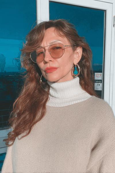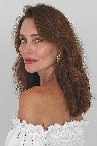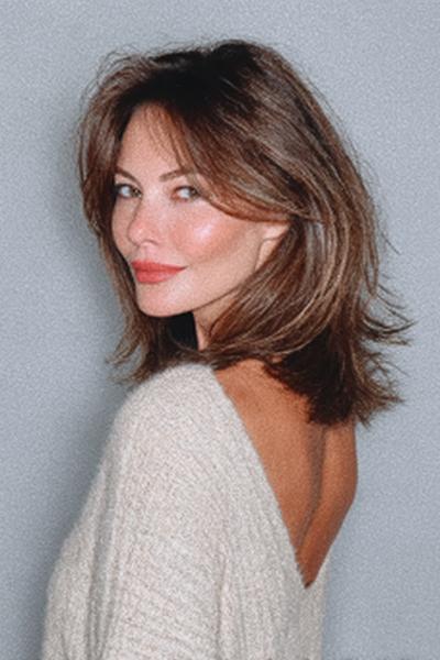 Zarte Curtain Bangs treffen auf hellbraune Toffee-Nuancen – pures Soft-Focus. Die Textur wirkt wie vom Sonnenkuss. Ein Hauch Stylingcreme an den Spitzen und etwas Shine-Spray ergeben glamouröses, entspanntes Finish.