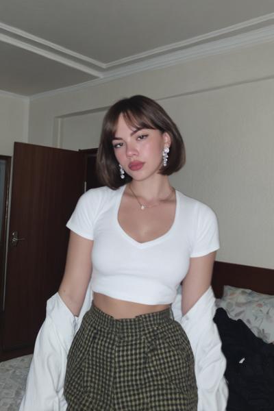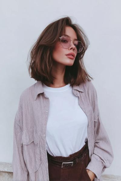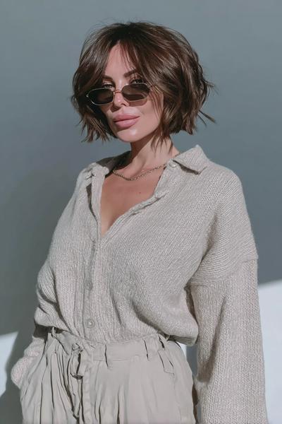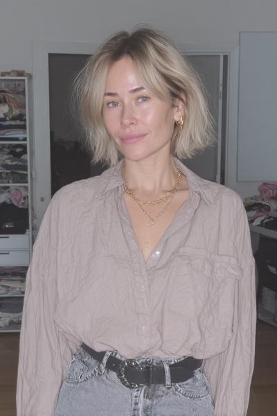 Ein kurzer, sandig-hellbrauner Bob mit luftigem Ansatz – minimalistisch und super chic. Ich würde die Spitzen stumpf schneiden und die Kontur soft pointcutten. Ein Hauch Trockenshampoo schenkt sofortige Fülle und matte, französische Nonchalance.