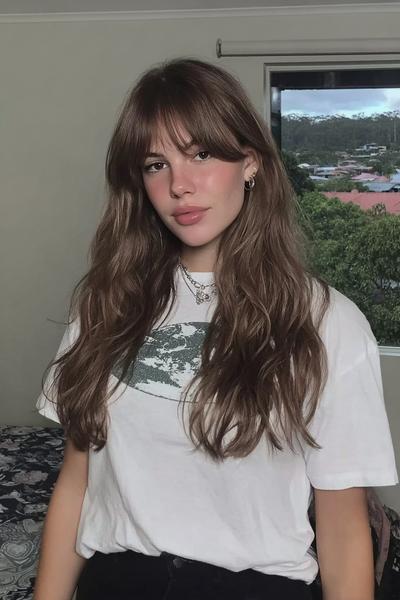 Modern Shag: hellbraune Haare mit Curtain Bangs