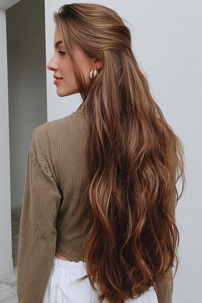 Half-up auf hellbraunen XL-Wellen sieht so romantisch aus. Ich liebe die weichen Lowlight-Schattierungen; sie bringen Tiefe. Mini-Claw-Clip, wenig Haarspray, fertig—Date-ready!