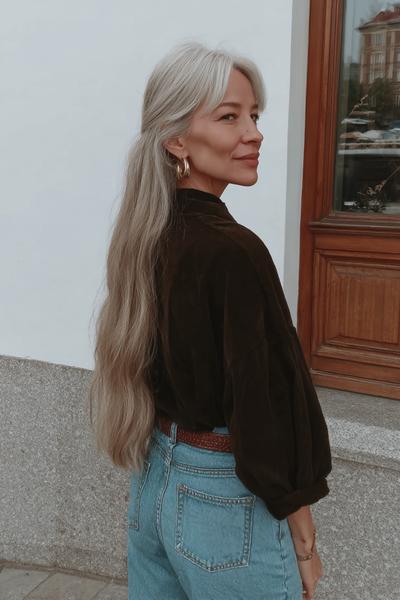 Aschig-kühles Hellbraun mit silbrigen Reflexen—ein edler Mix. Lange, glatte Wellen plus Mittelscheitel: minimaler Aufwand, maximale Präsenz. Feuchtigkeitspflege ist Key.