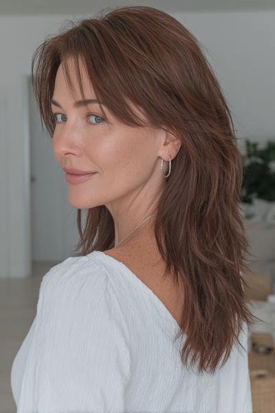 Dieser Shag in hellbraunen Haaren setzt auf Bewegung: sanfte Stufen, lockere Wellen und ein weicher Pony. Ich liebe den lived-in Vibe, glossige Spitzen plus Texturspray am Ansatz, und der Look wirkt sofort mühelos modern.