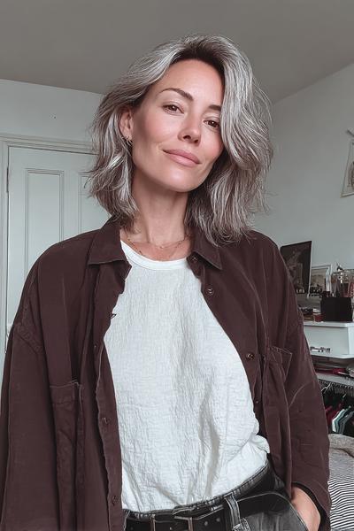 Diese Stufen lieben Kontrast: silberne Grundfarbe mit asch-hellbraunen Lowlights. Dadurch entsteht Dimension statt Flatness. Föhne mit Rundbürste für Luftigkeit, dann etwas Dry Texture an den Ansätzen – modern, weich, sophisticated.